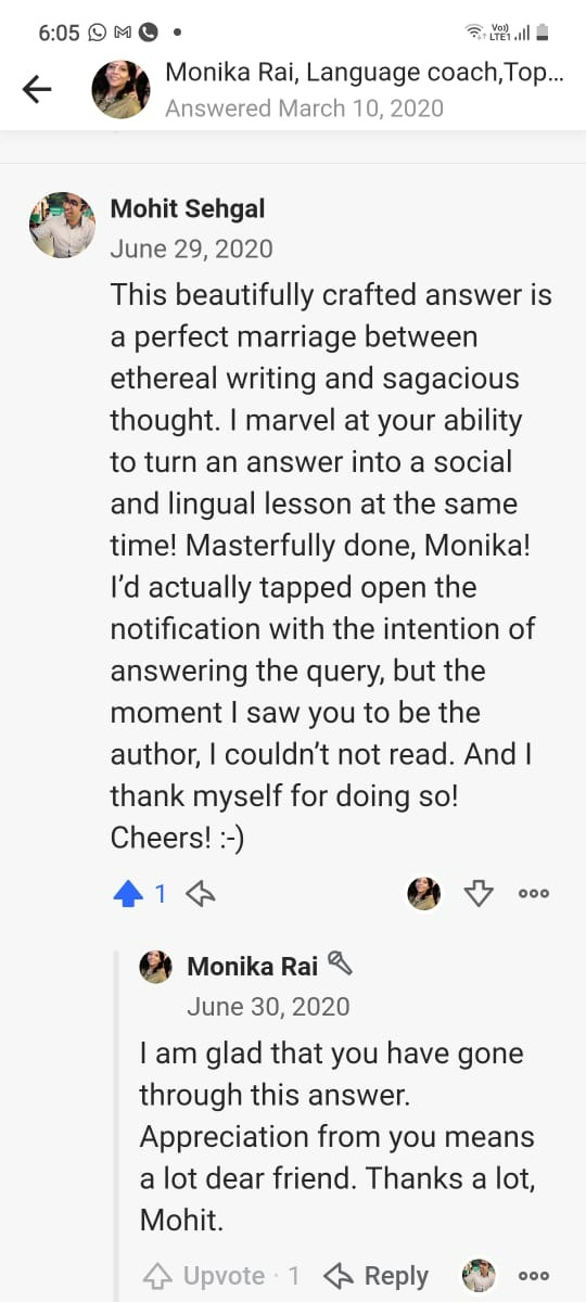 Monika Rai is an English / IELTS Trainer, Top Writer on Quora, Writer, Editor, You tuber & cofounder of SFE. She has a whopping 2,00,000 followers & 6.9 million views. Her Spoken English classes are quite engaging & friendly. She specializes in English Conversation, Grammar, Accent Training, Removal of MTI, & Vocabulary. She offers one of the best Online Speaking courses to learners from basic to advance levels. She has trained more than 5000 students & enhanced their English language skills; conducted Personality Development, Creative Writing, and Technical Writing classes.